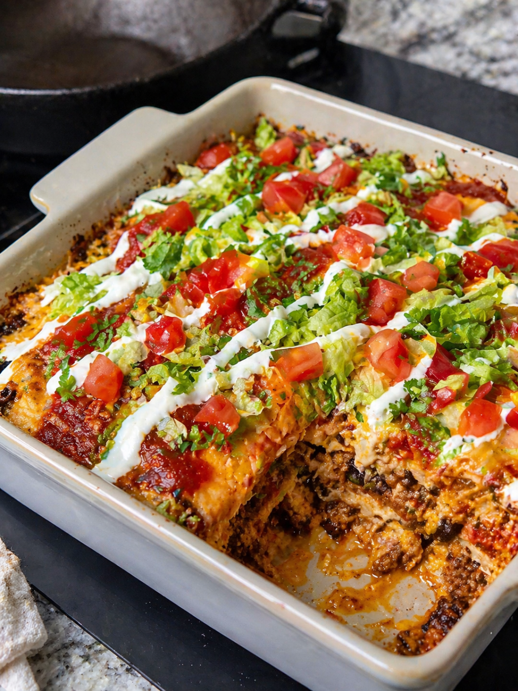 The top should be fully covered with salsa and cheese so the tostadas stay soft inside the casserole instead of drying out or burning.